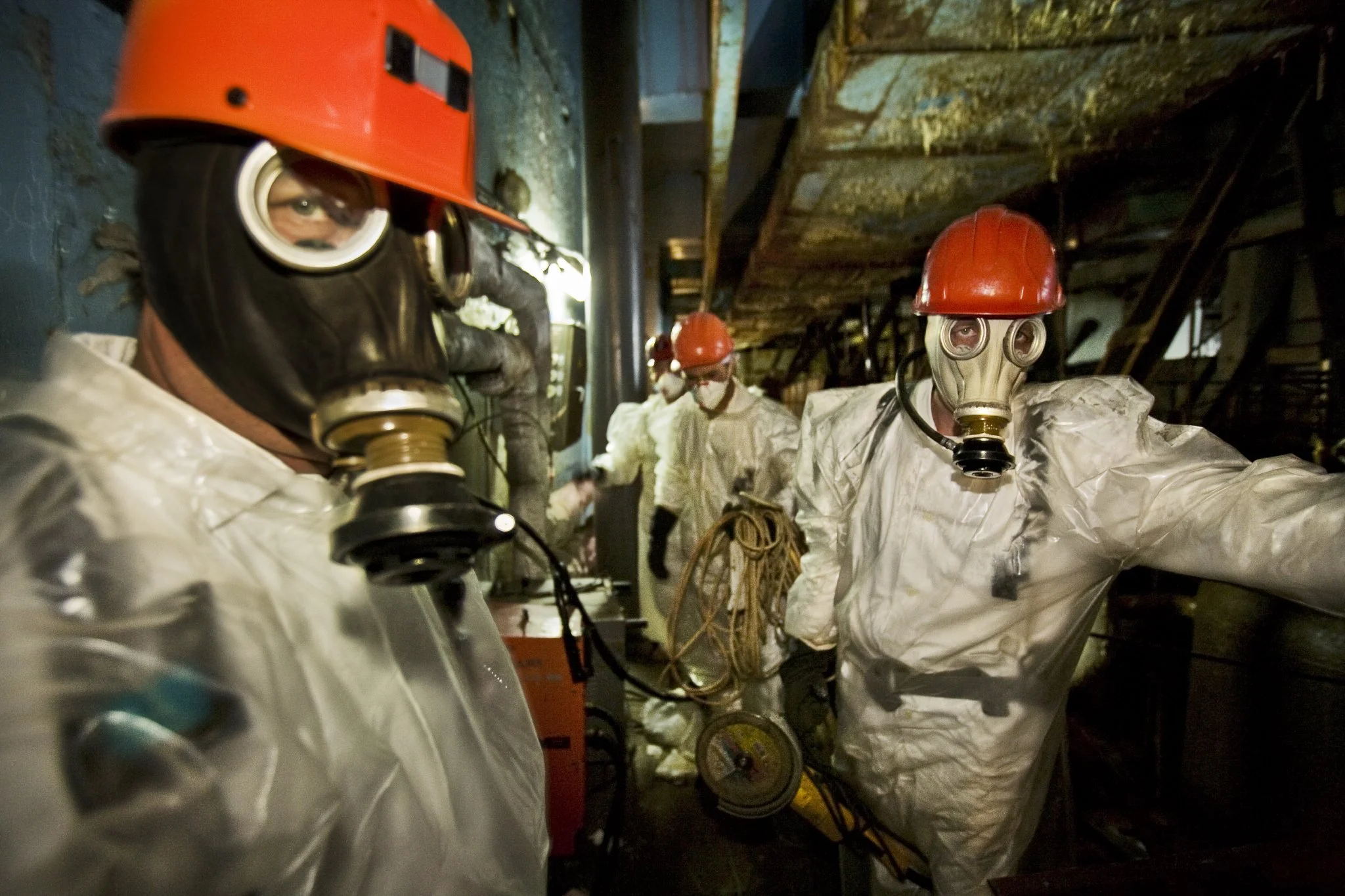 Workers, wearing respirators and plastic suits for protection, can only pause briefly on their way to drill holes for support rods inside the sarcophagus. It is hazardous work: radiation is so high that they constantly need to monitor their Geiger counters and dosimeters and are allowed only one 15-minute stay in this space.