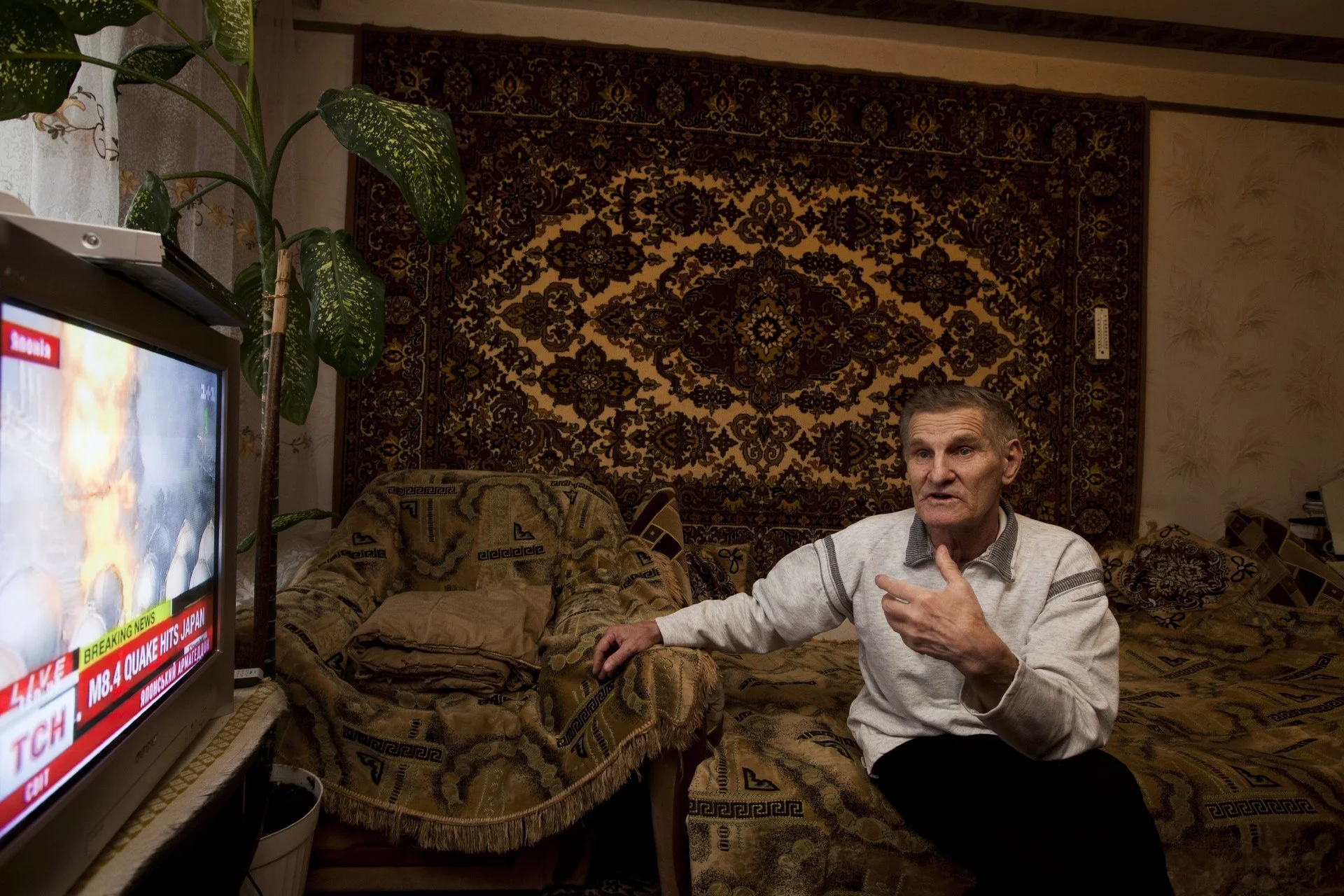Victor, 70, a liquidator of the Chornobyl accident, watches news of the nuclear disaster in Fukushima, Japan. A major in the army, he was on duty when the Chornobyl explosion occurred. After the disaster, he had two heart attacks and developed severe stomach cancer. Evacuated from Pripyat, he now lives with his family in Troeschina, a suburb of Kiev to which more than one-third of the population was relocated after the Chornobyl accident.